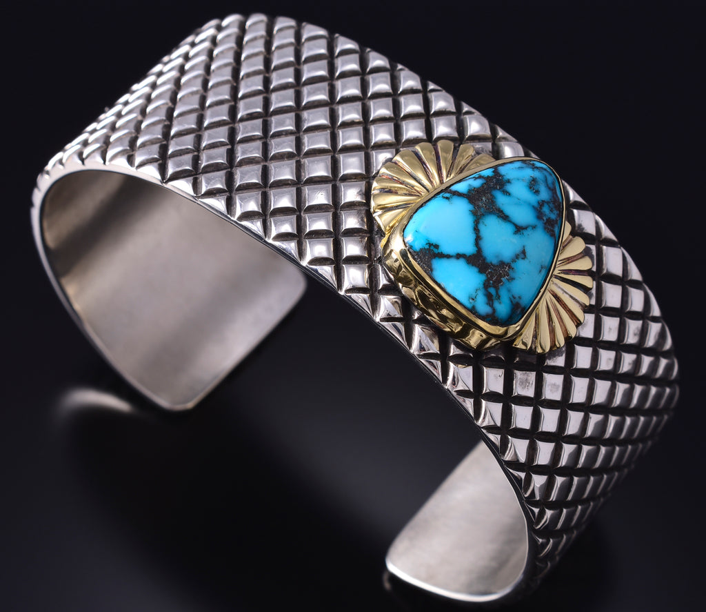 Silver & 18k Gold w/ Kingman Turquoise Navajo Bracelet by Erick Begay 5H01E