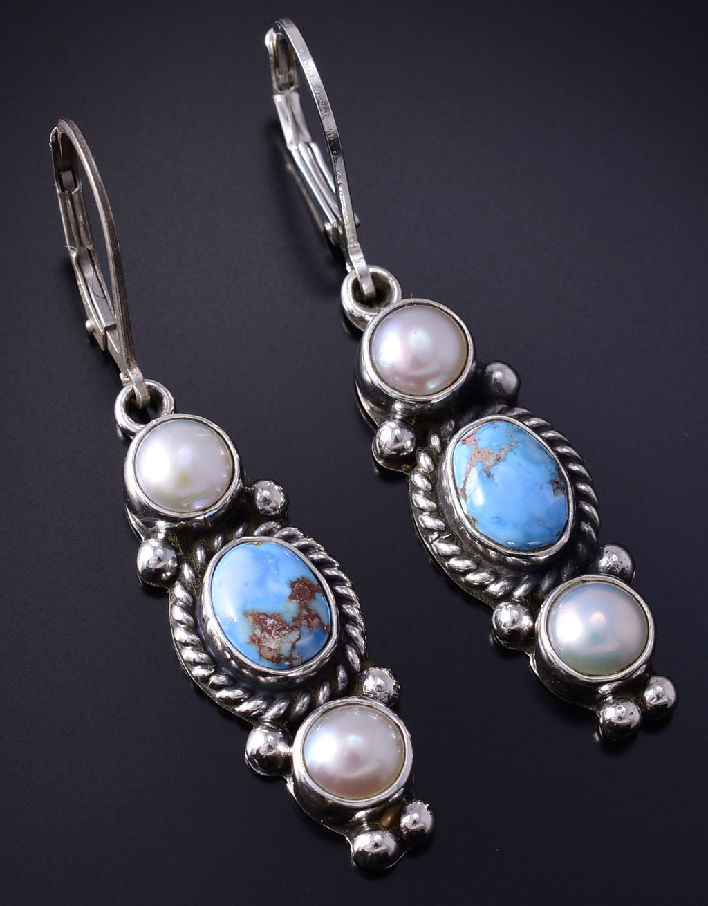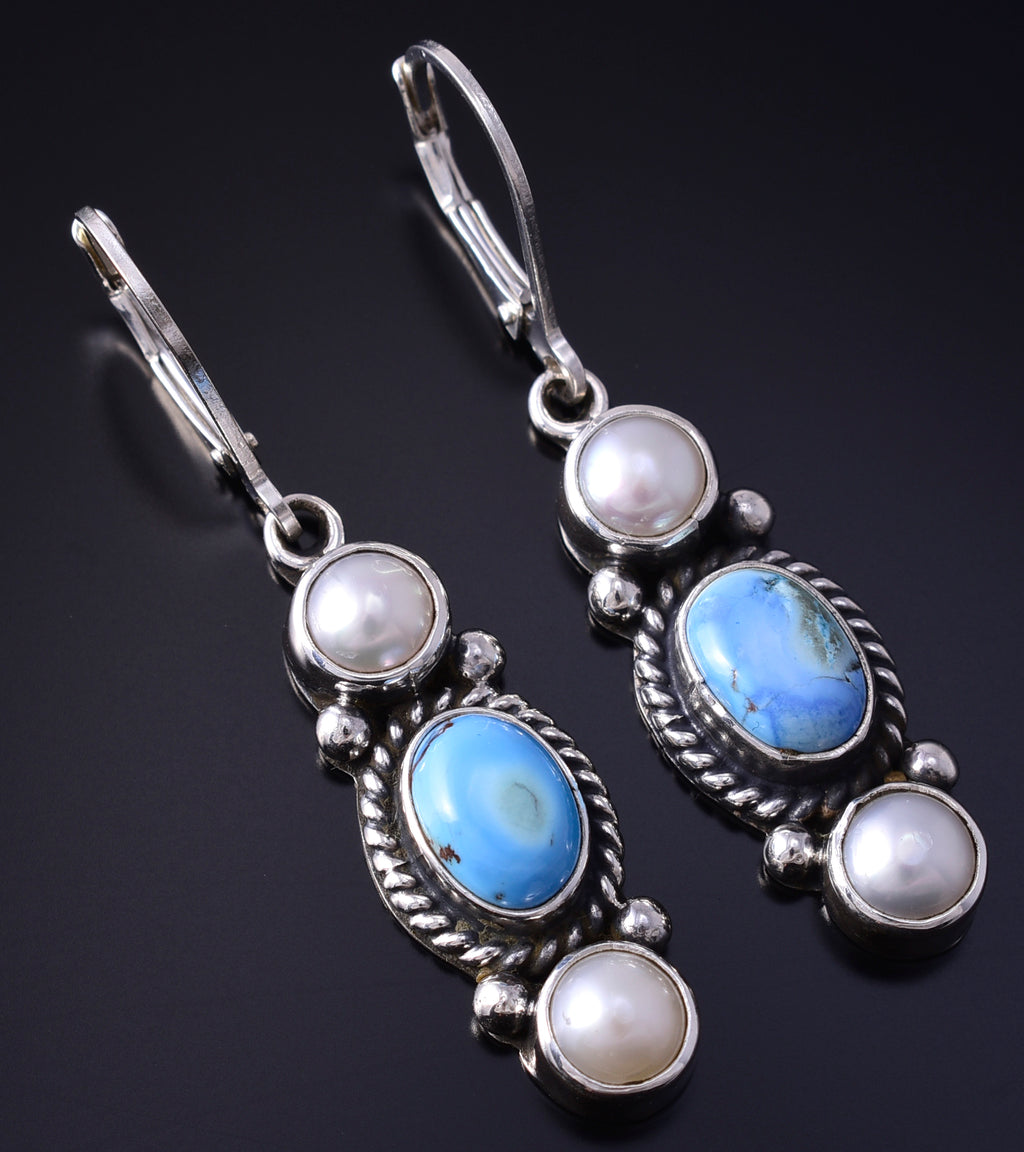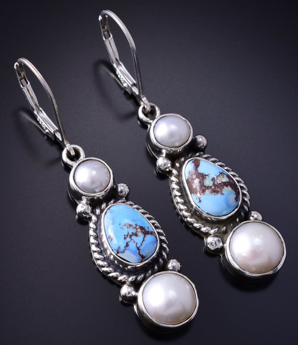 Silver & Golden Hills Turquoise Fresh Pearl Navajo Earrings by Erick Begay 5B25B