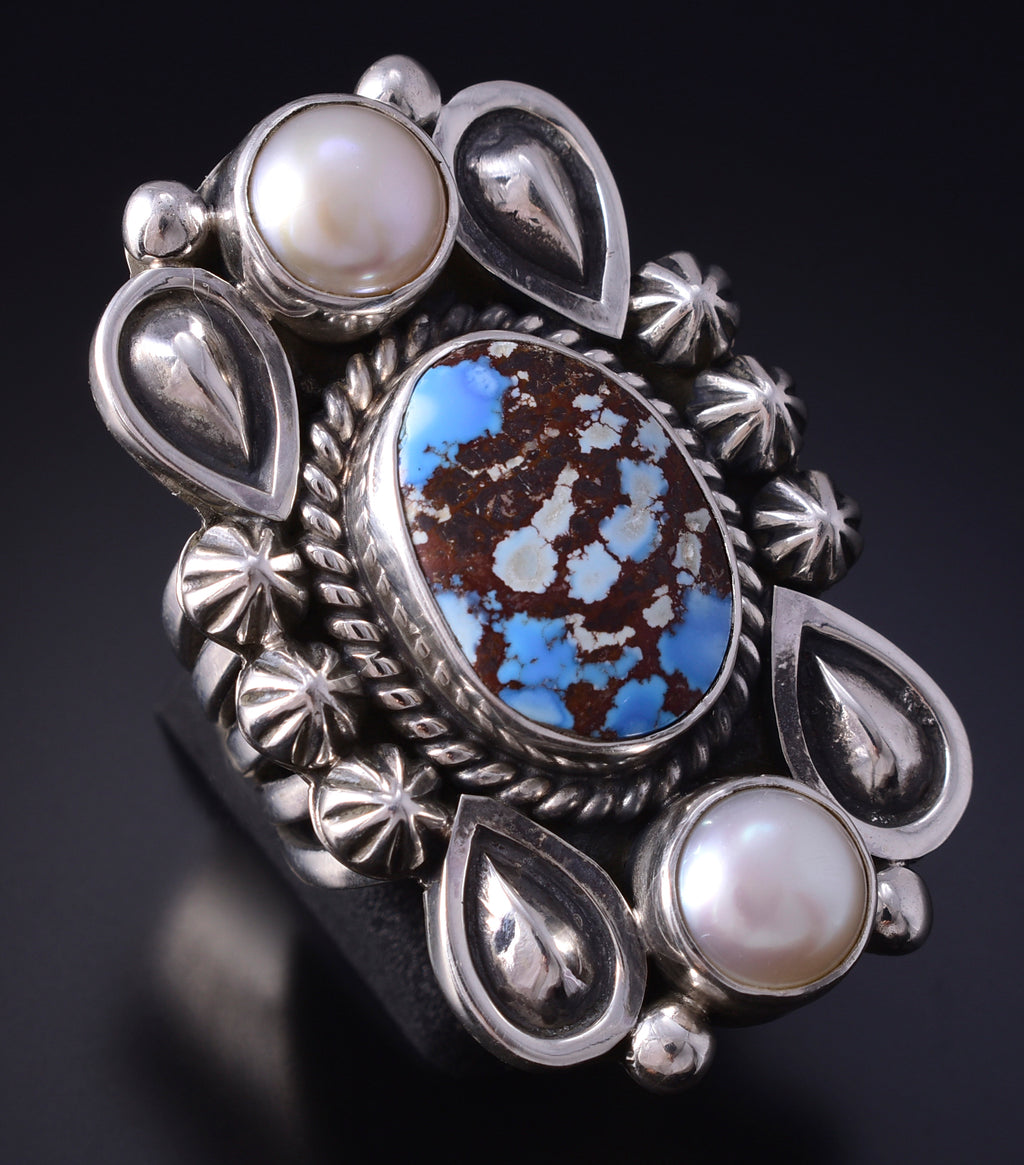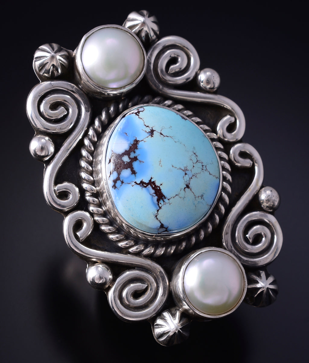 7-3/4 Silver & Golden Hills Turquoise Fresh Pearl Navajo Ring Erick Begay 5F30G